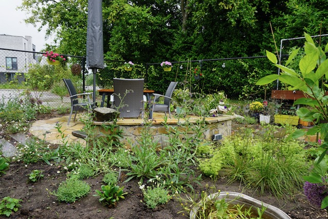 Het lage muurtje aan het terras (nog niet gemaakt op het moment van de foto's) is een extra zitplek. Tevens kunnen er nog 2 stoelen op het pad worden bijgeplaatst. Het pad heeft daardoor 2 functies: pad en terras. De pergola benadrukt het feit dat het pad bij het terras hoort. De laatste avondzon pak je op het ligbed achter de aanbouw. Het kleine vijvertje (ingegraven speciekuip) is aantrekkelijk voor mensen, vogels en insecten.